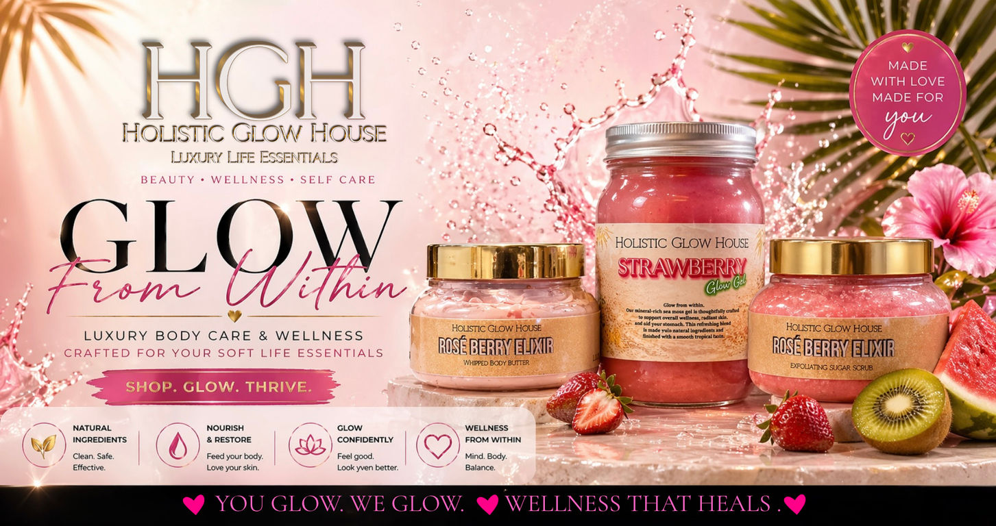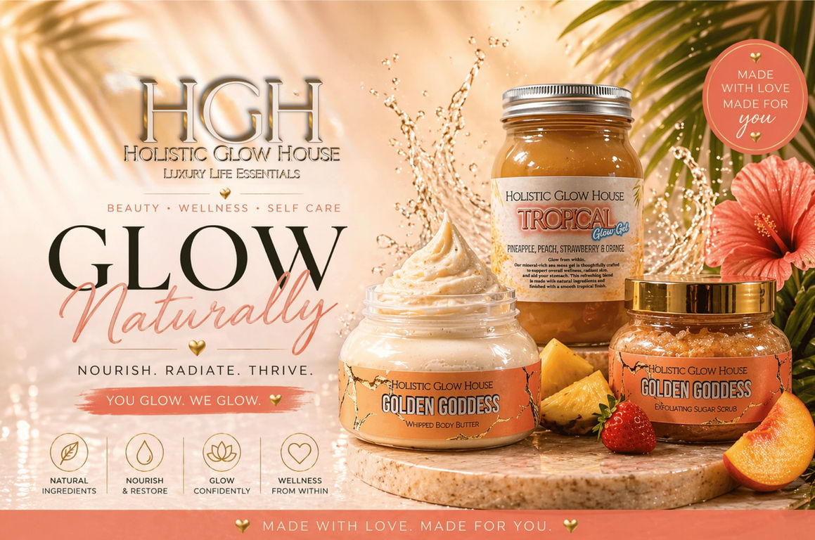 Welcome to Holistic Glow House, where luxury meets wellness. Our handcrafted body care and nutrient-rich sea moss glow gels are designed to nourish your body, elevate your self-care routine, and help you glow from within. From rich, creamy body butters to refreshing, fruit-infused blends, every product is made with intention, quality ingredients, and your overall wellness in mind.